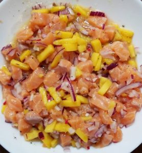 • קוצצים את כל הירקות ואת המנגו לקוביות ומערבבים עם הסלמון.