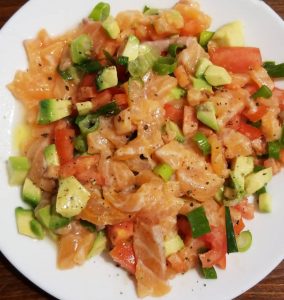• קוצצים את כל הירקות ואת האבוקדו לקוביות ומערבבים עם הסלמון.